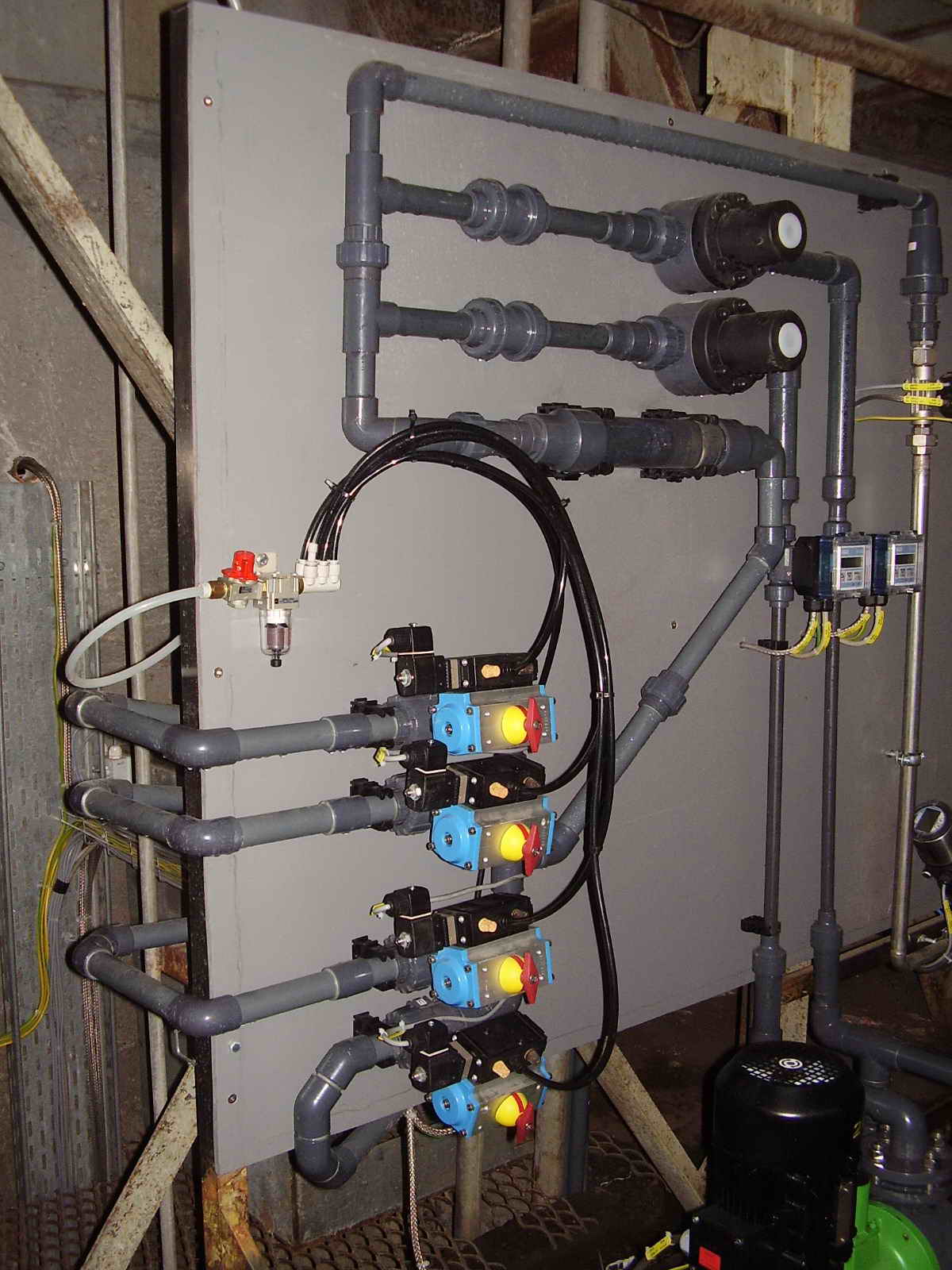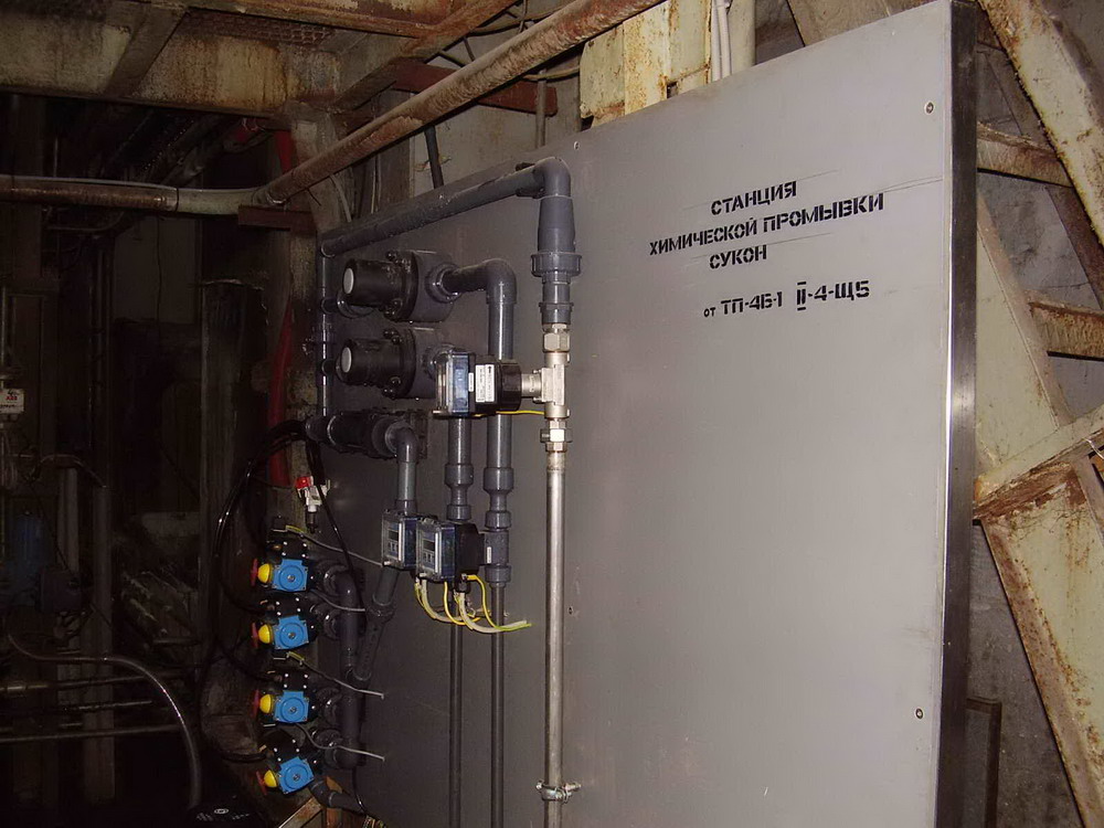 Установка, смонтированная в цехе по производству картона, предназначена для подачи растворов кислоты и щелочи на сукна КДМ (картонноделочная машина) для очистки от включений, которые содержатся во вторсырье, используемом при производстве картона.